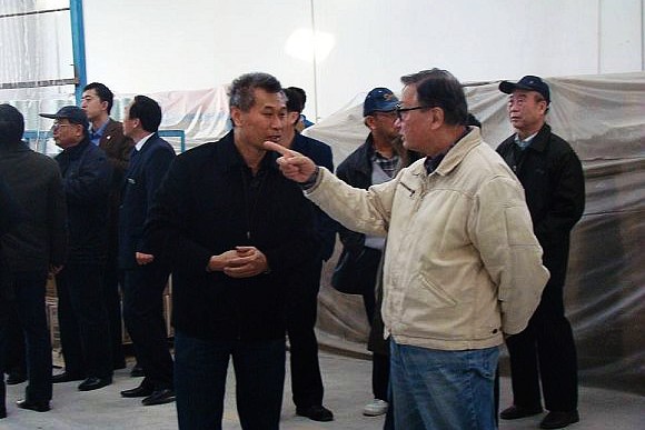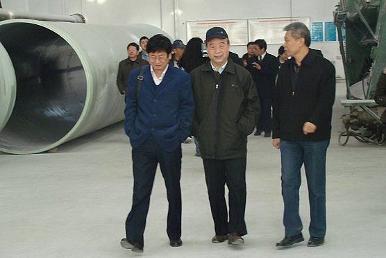 中咨公司能源部长朱良栋教授(中)、中国环境科学研究院于云江教授(左)参观Φ3200mm防海水大型玻璃钢管生产线.