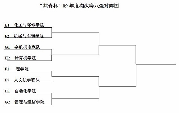 15:00小组赛比赛全部结束,化工与环境学院、人文法学联队、理学院、机械与车辆学院、宇航机电联队、管理与经济学院、自动化学院、计算机学院等八支球队顺利晋级。相信他们淘汰赛中会有更精彩的表现。小组赛积分统计与淘汰赛对阵阵型如下,敬请同学们继续关注“共青杯”精彩赛况。