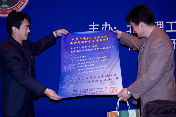 报告结束后ob真人部副部长杨海代表学校把一些具有学校特色的纪念品和此次报告会的海报赠予赵湘江教授,同时感谢赵湘江教授为我校学生党员开展学习实践活动提供了丰富的理论知识。
