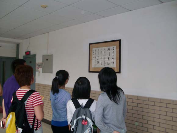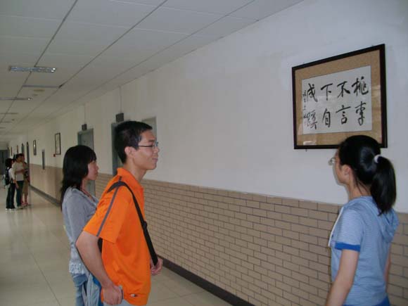 今年是“五四”爱国运动90周年,我校无阳斋书画社为纪念此次意义深远的运动特地书写了一幅幅励志名言悬挂于信息楼一层,精美的作品赢得了老师和同学们的一致好评。5月5日下午,学校副校长李和章在校团委书记徐强、副书记衡靖的陪同下来到信息楼饶有兴致地欣赏了悬挂出来的作品。其间李校长还嘱咐我们要认真学习五四精神,不要忘记自己所肩负的青春使命;也希望无阳斋书画社能在传承优秀传统文化和丰富校园文化生活的工作中贡献出更多的力量。