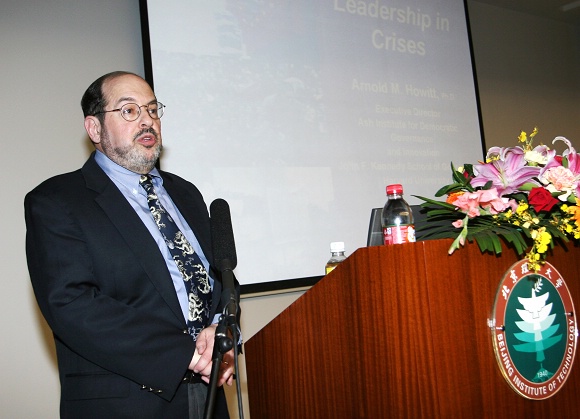 2009年5月4日,哈佛大学肯尼迪政府学院Arnold M. Howitt教授受邀到管理与经济学院进行访问,并在研究生楼102教室作题为“Leadership in Crises”的学术报告。校党委副书记侯光明热情接待了Howitt教授,对Howitt教授在ob真人竞猜代表团访问哈佛大学肯尼迪政府学院时给予的热情接待表示感谢,同时对他来校作报告表示热烈欢迎,双方互赠纪念品。