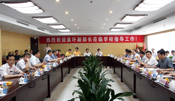 5月27日上午,工业和信息化部党组副书记、副部长苗圩,规划司司长莫玮,装备工业司司长张相木,节能与综合利用司司长周长益、副司长高东升,苗副部长秘书瞿国春等一行十人视察我校。校党委书记郭大成,党委副书记、工会主席侯光明,党委副书记赵平,副校长赵长禄、孙逢春、李和章及相关学院、职能部处负责人陪同考察并出席了汇报会。
