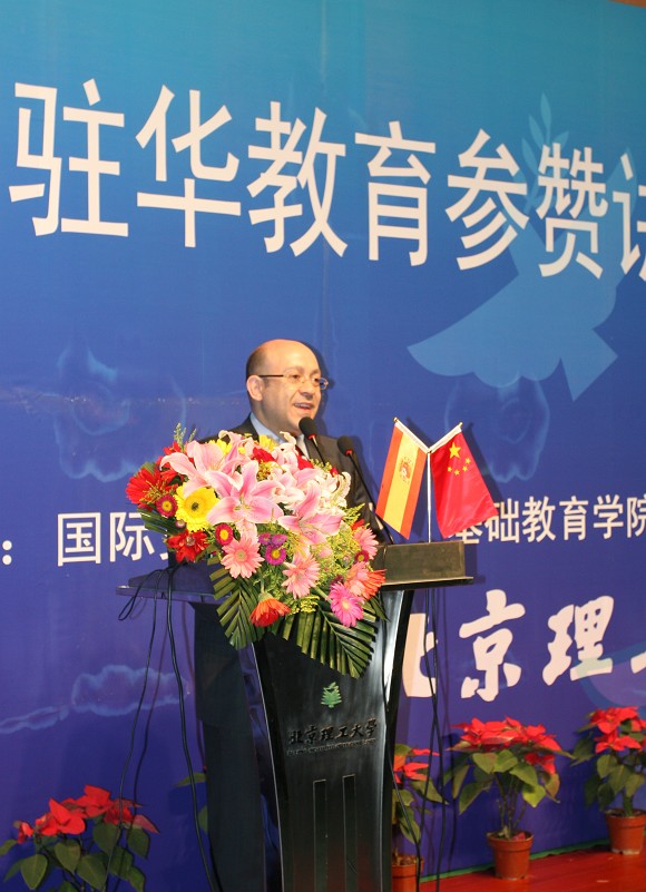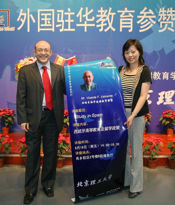 2009年6月19日下午,“外国驻华教育参赞讲座系列”之西班牙驻华参赞讲座在我校良乡校区举行。西班牙驻华大使馆教育参赞Vicente F. Valverde先生就西班牙高等教育、大学体制、专业选择、学习准备等问题发表了演讲。报告会由国际交流合作处副处长汪滢主持。
