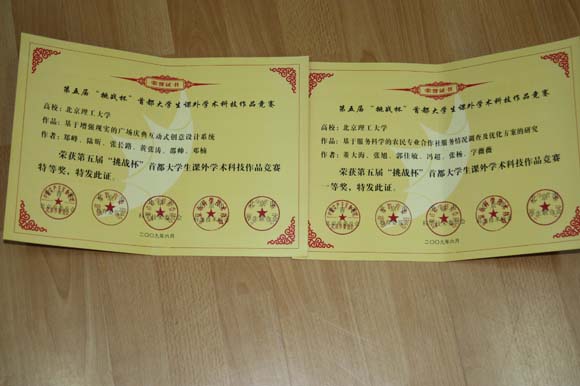 我院2支竞赛队在本次大赛中夺得优异成绩。其中,基于增强现实的广场庆典互动式创意设计系统夺得北京市特等奖(项目组学生:软件学院本科2006级郑峰、张长路、邵帅、陆昕、黄张涛,本科2007级邓楠,指导老师:李红松老师、张龙飞老师);基于服务科学的农民专业合作社服务情况调查及优化方案的研究夺得北京市一等奖(项目组学生:软件学院本科2006级张旭、董大海、张亮、冯超,本科2007级张杨、郭佳敏,指导教师:金福生老师、胡晓艳老师)。