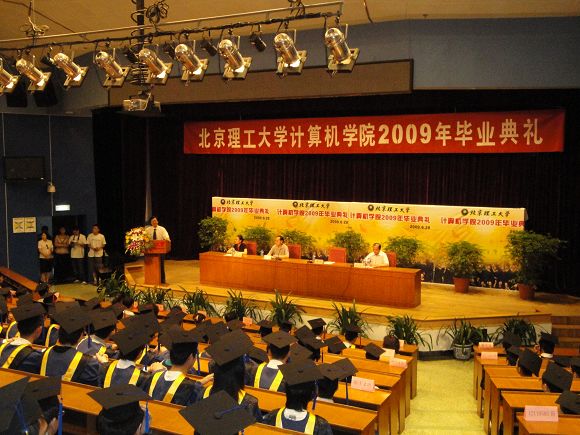 2009年6月28日上午8:30计算机学院2009年毕业典礼在中心教学楼一层报告厅隆重举行。计算机学院全体领导、学科负责人、教师代表和348名毕业生以及部分学生家长代表出席了本次典礼。毕业典礼由计算机学院副书记、副院长赵满老师主持。典礼在庄严的国歌声中拉开帷幕。