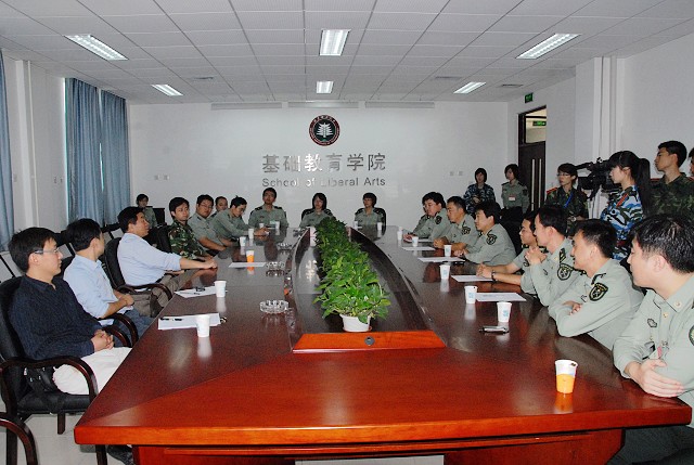 随后,郭书记在理学楼三层会议室分别与军训带队干部代表和军训学员代表进行座谈。在军训带队干部座谈会上,军训旅副总指挥杨海向郭大成书记汇报了今年军训的开展情况和特色工作。杨海副总指挥从“着力教育,注重效果;深化形式,培养作风;加强交流,了解情况;强化制度,保障安全;锻炼队伍,有所收获”五个方面总结了2009年军训工作开展以来所取得的成效和存在的不足。