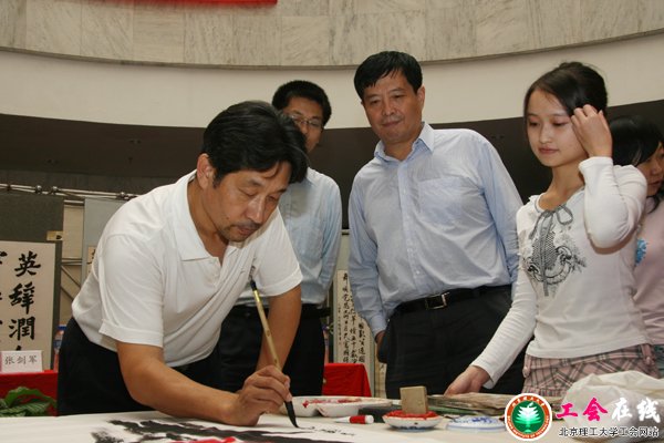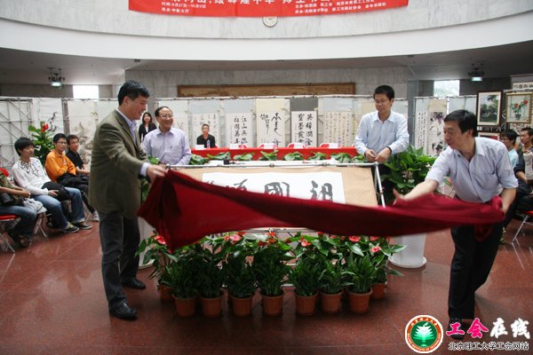 侯光明、张剑军等老师为展览揭幕。揭幕后,在大厅现场进行了交流笔会。笔会上,校工会王玉伟老师现场挥毫展现了他独到的国画意境、黄发荣老师兴致勃勃地为大家表演了他独具魅力的篆隶笔法,他们对书画社社员和现场观众做了细致精辟的指点,并送出多幅作品给观展同学作为纪念。