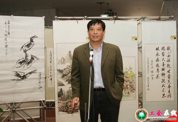27日下午2时,展览开幕式在中教大厅举行,校党委副书记、工会主席侯光明、工会常务副主席张剑军、副主席王建光、离退休教职工工作处处长刘川、校团委书记徐强、校团委副书记衡靖,以及学生社团无阳斋书画社老社长黄发荣等领导老师出席了开幕式。