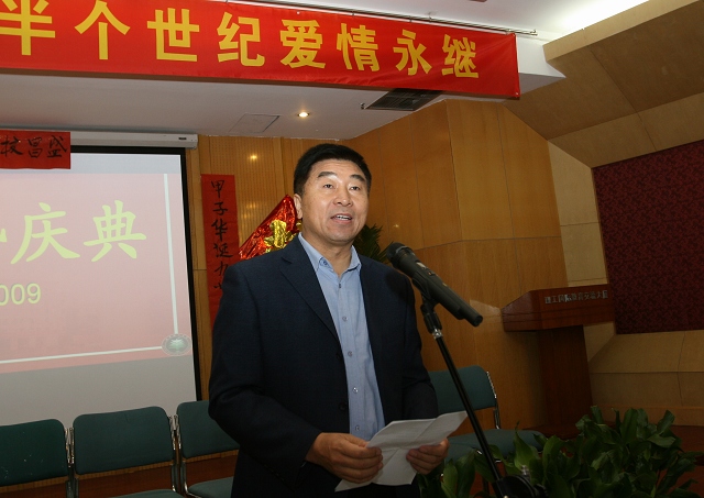 郭大成代表校党委和行政向金婚夫妇致贺词,向金婚夫妇五十年的相濡以沫、相依相伴表达了美好的祝愿,高度赞扬老同志为理工大学的和谐发展和新中国的建设事业做出了重要贡献。