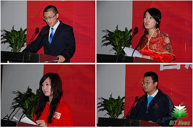 来自国庆活动不同团队的6名师生就各自的经历和感想做了大会发言。基础教育学院08级辅导员刘京智代表群众游行教练员讲述了组织训练和各项筹备工作的点滴回忆,国防生李睿豪代表群众游行参训学生回忆了大家战高温、斗酷暑的难忘历程,08级学生卲建琨代表彩车大队讲述了“推车手”的默默奉献和取得的成绩,张佳燕、王艺潼、秦虓分别代表我校参与广场合唱、群众联欢和志愿服务的师生描述了各部门工作的艰辛和大家展现出来的风貌。