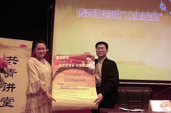 武老师的语言十分丰富,逻辑缜密,他用系统逻辑的语言阐述了“黑社会性质”“犯罪”等概念,介绍了我国“打黑除恶”的发展形式,讲述了自己和队友们如何追回“9.18大案”失窃的69件文物。武老师用“板凳四条腿”的理论系统阐述了黑社会形成的四个条件和三个进化阶段,并对当前我国面临的“黑白黄花蓝”问题进行了深入分析,最后对中国民主法制进程进行了总结。武老师讲话引经据典、旁征博引,从“武”转“文”让他极具现代化气息,同学们都聚精会神地听讲,不时被武老师幽默睿智的语言所感染。