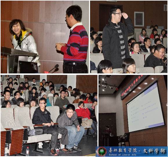 11月12日晚,在良乡校区综合楼报告厅,“赢在起跑线”新生教育精品课程第二课开讲,本次课程主题是“大学生人文素养教育”,设计艺术学院分党委书记杨海滨为09级三百多名新生带来了《文学与人生》主题讲座。