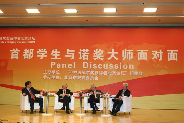北京市教委副主任郭广生出席该活动并致欢迎辞,中央财经大学副校长李俊生教授作主持人。来自美国、英国的三位诺贝尔奖获得者介绍了自己在科学研究方面的经历和见解,并回答了学生们关心的金融重建与经济振兴、个人职业规划等问题。同时,三位嘉宾也就感兴趣的话题向在场的学生们提出了他们的问题。在与大师两个小时的对话中,同学们领略了大师们的人格风范和人生智慧,开阔了视野。作为此次活动的组织单位,ob真人学生在活动中表现出的良好的精神风貌也得到会议主办方的高度赞扬。