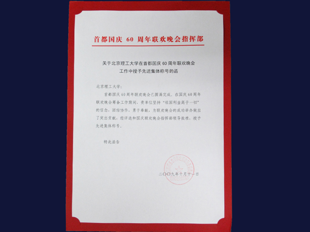 同时,为了感谢学校全体参演师生为联欢晚会的筹备所付出的努力与汗水,首都60周年联欢晚会指挥部还特意为每个人制作了由中共中央政治局委员、中共北京市委书记刘淇和北京市人民政府市长郭金龙签发的纪念证书,以示纪念。