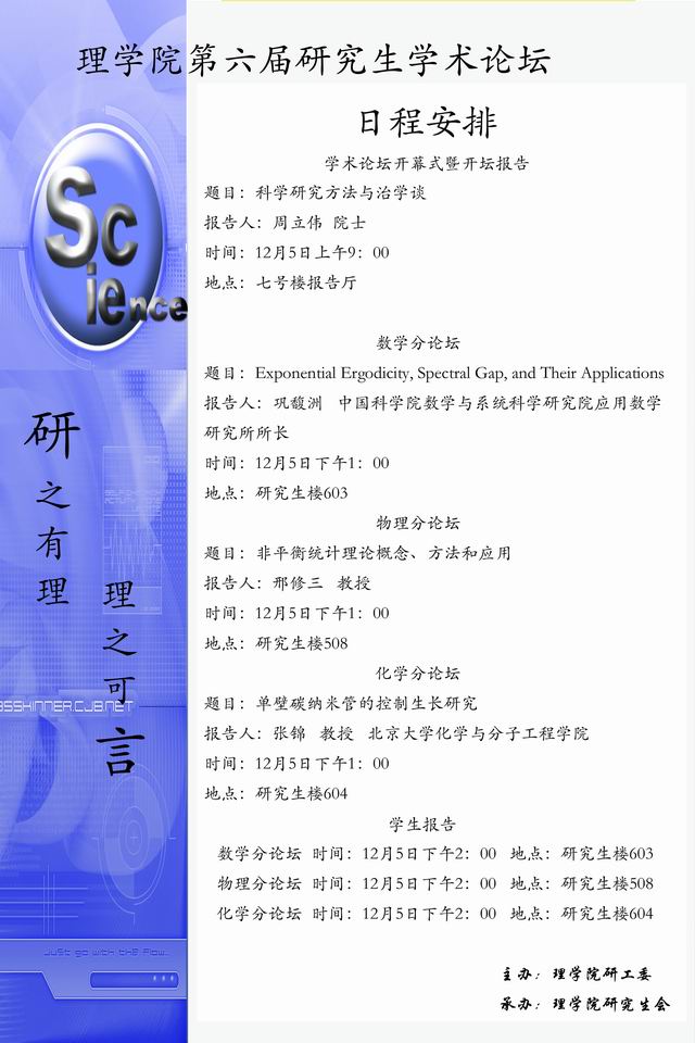 在周院士激人奋进的开坛报告之后,理学院第六届“研之有理 理之可言”研究生学术论坛之数学分论坛、物理分论坛、化学分论坛也拉开序幕,校内外知名学者将为论坛带来学科前沿的学术思想和成果介绍,学生报告人也将带着自己的研究成果相互切磋交流,同学们将享受一场学术的饕餮盛宴。预祝本次学术论坛圆满成功!