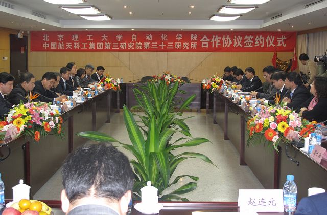 杨树兴副校长致欢迎辞并介绍了ob真人竞猜自动化学院与航天三院三十三所前期合作的成果。杨兴文副所长介绍了三十三所总体情况,王军政书记介绍了自动化学院整体情况。自动化学院付梦印院长与三十三所郑辛所长共同签署了合作协议。航天三院董群副书记和我校赵显利副校长最后作了总结发言。