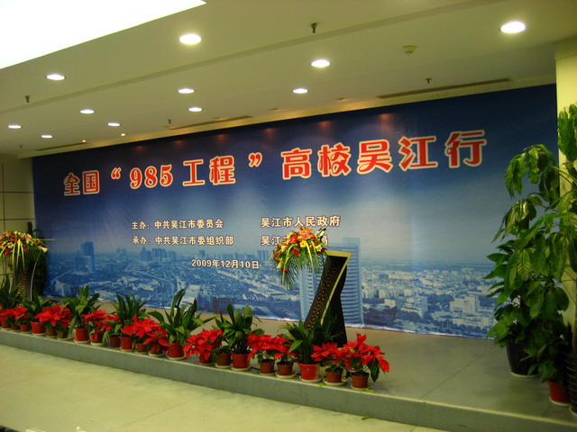 2009年12月10日,江苏省吴江市政府举办的“985高校吴江行”活动拉开帷幕,就该市相关人才引进工作进行了会谈交流,同时会议宣布:2010年中共吴江市事业单位公开招聘“985高校”优秀学生干部工作也正式启动。全国33所985高校应邀参加了此次会议,我校招生就业工作处张宏亮参加了会议。