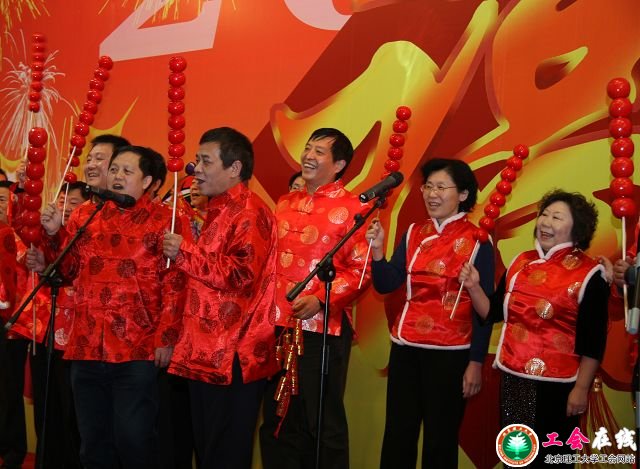 我校工会参加了两个节目的演出:校工会干部王丽静的女声独唱《举杯吧 朋友》,合唱《冰糖葫芦》(高校工会第四片组集体节目)。“举杯吧朋友,这酒里歌与爱唱尽了风流,干一杯让我们从头携手”,嘹亮欢快的歌声,演绎着幸福旋律,唱出了大家内心的喜悦;“冰糖葫芦——”在京味十足的吆喝声中,身着喜庆唐装的高校工会第四片组的演员或举着大大的“冰糖葫芦”,抑或拎着虎年吉祥物、中国结登上了舞台,“糖葫芦好看它竹签儿穿,象征幸福和团圆,把幸福和团圆连成串,没有愁来没有烦”,在欢乐的歌声中,演员们将酸酸甜甜的冰糖葫芦送到了大家手中,首都师范大学工会的老师当场挥毫写下了“虎年大吉”四个大字,第四片组演员齐声恭祝大家“虎年大吉,新春快乐”,整个会场鼎沸,将联欢会气氛推向了高潮。