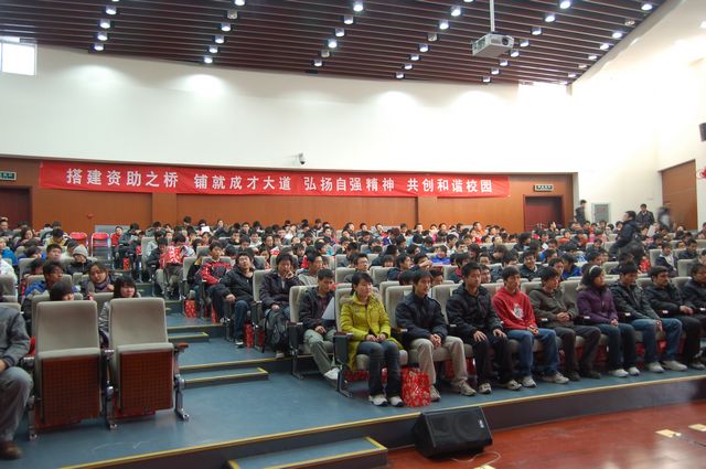 1月29日,ob真人良乡校区综合教学楼综合演艺厅内洋溢着阵阵欢声和融融暖意,345名2009级家庭经济困难学生代表济济一堂,参加了学校组织的,以“年年寒冬送关爱 情暖学子创和谐”为主题的2010年春节“向学生送温暖”活动仪式。