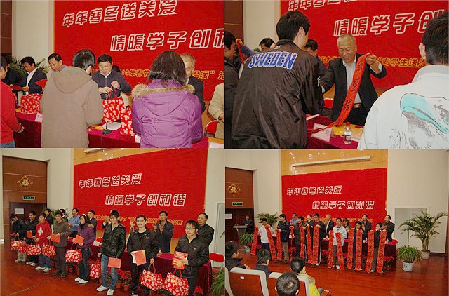 会上,学校领导为学生代表发放了寒假往返路费、慰问品,并向他们赠送了由学校领导、老师书写的春联。