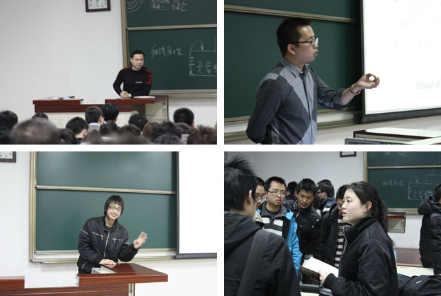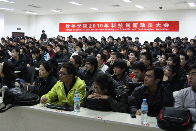 首先,陈杰浩老师向同学们介绍了软件学院2010年开展科技创新活动的工作思路、工作计划以及总体要求。2010年,软件学院一方面将大力加强学生开展科技创新活动的舞台建设,通过舞台提供更多更好的锻炼机会,通过锻炼机会培养出更多更好的优秀人才;另一方面,软件学院将大力加强科技创新文化氛围等软实力的建设,在科技创新活动之余开展丰富多彩的学生文体活动,引导学生参加体育运动锻炼,增强体魄,引导学生积极开展文艺活动,使科学、艺术、管理全面融合,建立一个“来了就不想走,来了就必有收获”的科技创新氛围。随后,陈杰浩老师向2008级学生、2009级学生就本学期开展科技创新活动的计划做详细的介绍,对于2008级学生,本学期将通过成立项目组的形式进行管理,通过一个项目组带起一个队伍的学生,通过一个项目培养出一个队伍的人才,在此过程中培养学生的工程能力、科研品质、科技创新友谊!对于2009级学生,将通过社团基础技术的培训,培养学生扎实基础知识和编程能力,培养学生的学习能力、科技创新兴趣,为日后的科技创新活动奠定扎实的基础。最后,陈杰浩老师要求全体学生发扬软件学院学生科技创新“锅炉房”精神,开拓进取、艰苦奋斗,在2010年取得更优异的成绩!