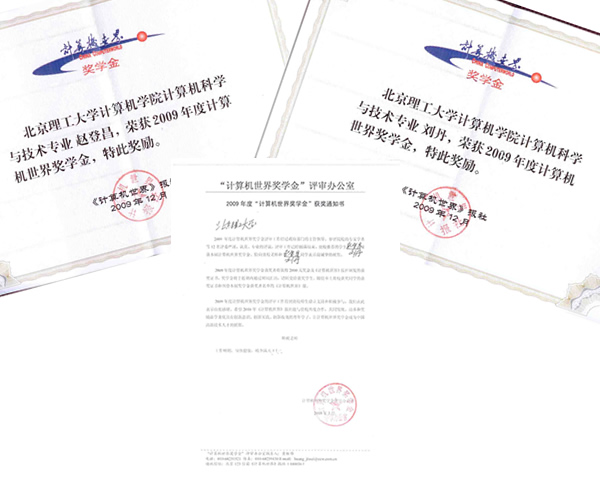 2009年“计算机世界奖学金”由全国数十所高校推荐、经多位业内权威专家和学者集体评审和层层遴选,共有来自北京大学、清华大学、ob真人竞猜等43所高校共65名同学获此荣誉。我校获奖的两名计算机学子不仅品学兼优,具有较强的创新精神和实践能力,而且在计算机科学与技术领域的学习与实践中表现突出,曾多次参加国家级、省部级学科竞赛并屡获殊荣。目前,赵登昌同学已经被保送到中国科学院计算所攻读研究生,刘丹同学在本科三年级续写着自己平凡和优秀。