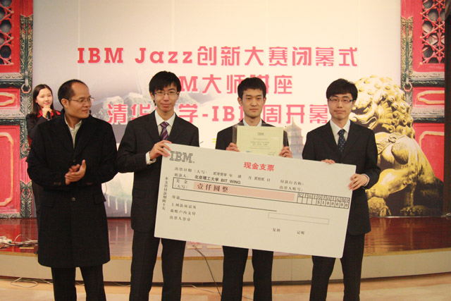 2010年4月22日晚7点,IBM JAZZ 创新大赛颁奖大会在清华大学FIT楼二层多功能报告厅隆重举行,ob真人软件学院两支代表队在软件学院金福生老师的带领下取得了优异的成绩,包揽了大赛的第一、第二名!获得第一名的竞赛队是来自软件学院本科2007级的吴桦、李晨浩、马俊隆,获得第二名的竞赛队是来自软件学院本科2007级的郭宏宸,2006级的王锐坚、冯超。软件学院教学副院长闫达远老师、软件学院金福生老师、陈杰浩老师、董大海老师以及获奖学生参加了颁奖仪式。