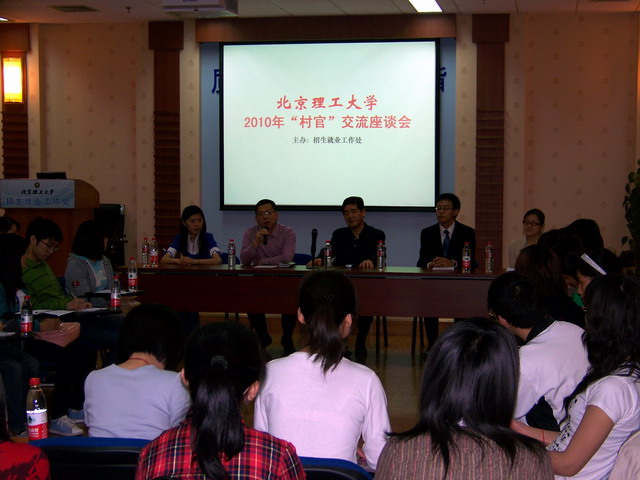 2010年北京市村官报名工作已于5月5日结束,为了使有志于到北京农村建功立业的大学生对村官工作和未来的就业去向能有更加客观和全面的了解,学校就业办公室特邀2006届村官李岚校友(已到期,现就职于牛栏山镇政府)、2007届村官陈延涛校友、2008届村官刘斐校友回母校与学弟学妹们交流座谈。