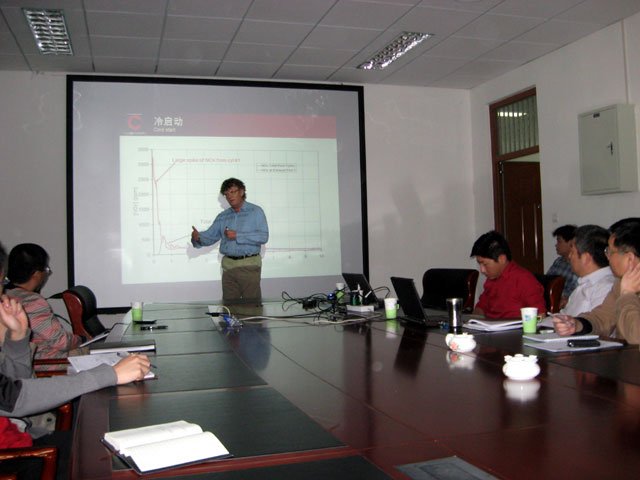 首先,Nick Collings教授结合目前自己的主要研究工作做了《柴油涡轮增压轿车的实时EGR流量分析及NOx排放的影响》、《多缸汽油机SI-HCCI-SI变换控制方法的实验研究》和《针对GDI及柴油发动机的快速气体和颗粒物测量》等精彩报告。并与现场的教师和同学针对汽车排放测试、柴油机和汽油机的瞬态测试和标定等方面的先进技术进行了充分交流。