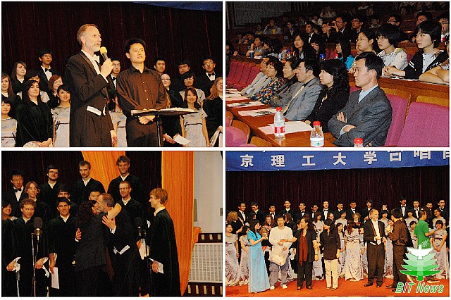 演出结束后,Gerald Langner博士与贺春华教授分别发表讲话。Langner博士很感谢我校如此热情款待他以及他的学生们,他为能够参加我校校庆70周年的系列演出感到非常的荣幸,并高度评价了我校合唱团的演唱水平。贺春华教授表示,音乐可以将相隔千里的人们聚集在一起,大家有着不同的肤色,不同的文化背景,不同的语言,但是音乐却令大家心有灵犀,心心相印。音乐无国界,这正是音乐的魅力所在。