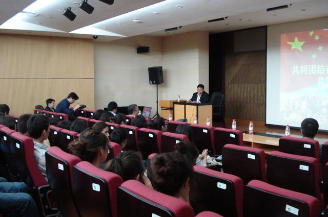 在随后的宣讲环节,吐鲁洪•托合提代表调研组以“感恩伟大祖国,建设美好新疆”为主题,用维吾尔语为少数民族学生代表作报告。同时也向同学们提出了几点要求,希望同学们擦亮眼睛,明辨是非,积极维护社会稳定;牢记使命,勤勉自励,努力提高自身素质;勤俭节约,艰苦朴素,传承中华民族的优秀品德。同学们纷纷感谢调研组一行为大家带来了关怀和问候,并表示要在今后的学习生活中努力学习、积极实践、回报社会,为祖国建设、西部发展贡献力量,为国家繁荣、民族团结做出贡献。