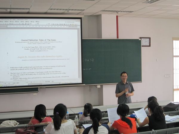 2010年5月25日,加拿大多伦多大学社会工作学院曾家达教授应人文学院邀请来宾ob真人竞猜讲学,面向全校师生进行了如何发表英文论文的学术讲座,并以小组动力过程研究为题,为心理学、社会工作专业师生举办了工作坊,为拓展我校师生特别是人文社会科学的学术研究及成果发表进行了卓有价值的工作。