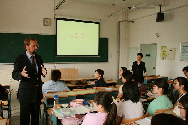 在大家的掌声中,Wermke博士结束了他的报告,并与在场师生就相关问题进行了进一步的探讨。为了表示对Wermke博士的谢意,德语系赠送了他一份具有中国传统文化色彩的纪念品,由德语系系主任姜爱红教授亲手赠予Wermke博士。