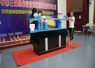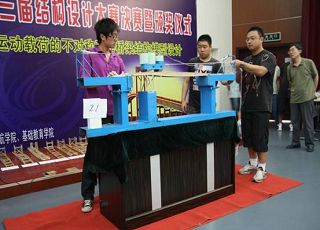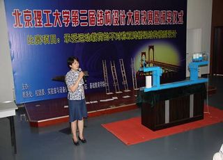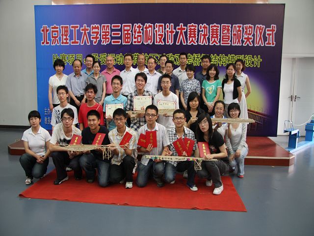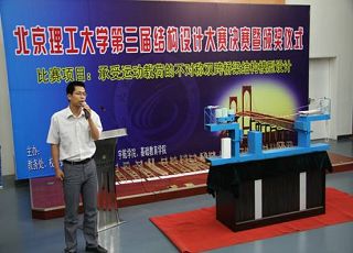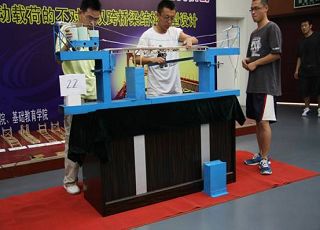 此次大赛的题目为承受运动载荷的不对称双跨桥梁模型设计。进入决赛的22组选手带来了各自精心制作的桥梁模型,决赛中选手要让一个重达15千克的钢制小车顺利通过自己设计制造的桥梁模型。比赛规定模型制作材料为桐木和白乳胶,不允许使用任何其它材料。经过紧张激烈的比赛,最后有4组同学制作的桥梁模型成功通过了小车。