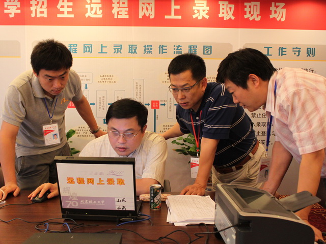 胡校长首先查看了山东、北京、云南等省份的录取情况,听取了招生就业工作处处长、招生工作领导小组成员郝志强关于近期招生工作开展情况的汇报。胡校长查看了部分考生的资料,并仔细询问了报考我校的同学主要来自哪些中学,有多少来自于我校重点生源基地中学。当了解到考生专业志愿不满足需要调剂的情况下,工作人员会参考考生报考其它高校的志愿专业进行调剂,充分尊重考生意愿的做法时,胡校长指出:我们的工作是为考生服务的,我们要充分为学生着想,像这样人性化的做法很好。胡校长还与郝处长还就各省生源倾向于报考我校哪些专业,平行志愿省份的录取情况以及我校专业建设、人才培养等方面的问题进行了分析讨论。