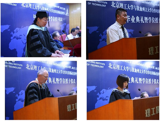 在优美的毕业音乐声中,犹他州立大学国际合作教育处主任Li Li博士宣读了53名荣获犹他州立大学学士学位的毕业生名单,副院长Dr .Chris Fawson,Li Li博士和Dr. Tyler Bowles给毕业生颁发了学士学位证书并一一合影留念。Dr. Tyler Bowles代表犹他州立大学Jon M. Huntsman商学院授予李璐同学2010年度杰出毕业生称号,并颁发犹他州立大学Jon M. Huntsman商学院杰出毕业生奖牌。
