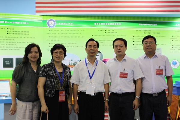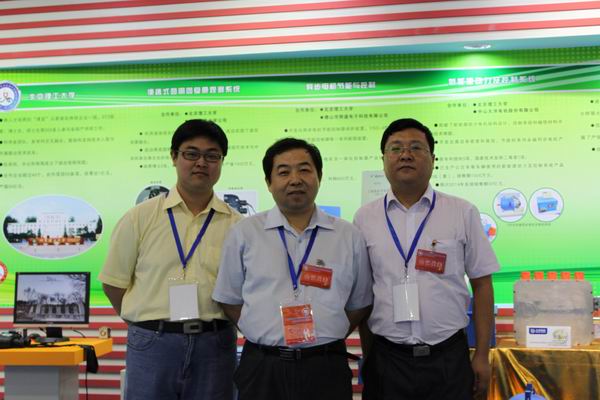 总结大会的同期还进行了创新成果展。此次展览中代表我校参展的项目有三个:便携式圆明园复原观察系统、异步电机节能技术研发及产业化和新能源动力控制系统及产业化,分别是我校和中山美景光学有限公司、佛山市烨盛电子科技有限公司、中山大洋电机股份有限公司共同的合作的成果。杨树兴副校长来到创新成果展览会现场,参观浏览了我校及其他高校、企业的产学研创新成果。