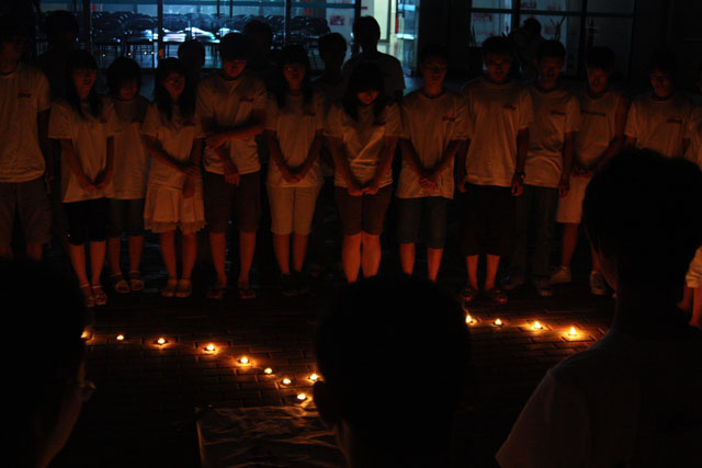 同学们签完名后,一个个自发的点起白烛,在软件楼前的空地上摆出心形,大家用身体围住这个“心”,让烛火在庇护中长明,这就像同学们用生命去守护所有受灾的同胞们,为他们遮挡风雨,为他们祈福哀悼,三分钟的默哀,烛火摇曳,没有喧哗,没有欢笑,甚至在默哀结束后,同学们都久久的伫立。