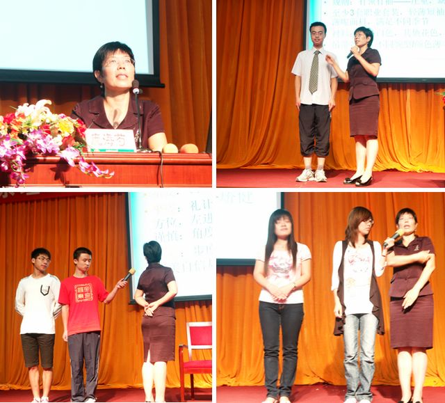 抬头,挺胸,注意微笑。良好的服务姿态,要求志愿者们从站姿、行走、步速、转身、微笑……每个动作分解练习上千次。“两脚呈丁字形,左脚脚跟贴在右脚的内侧,两腿将膝盖间的纸夹好,两手自然地放在腰间。眼睛平视前方,面带微笑,头上的书顶好不能掉……”庞书记一边说一边纠正着同学们们的动作。