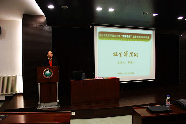 设计学院副院长杨建明代表学院致词,他对李成才先生的到来表示衷心的感谢和热烈欢迎。并表示我们需要更新的艺术观点和理念,运用前沿的视角去诠释文化,用经典文化传播民族精神。德以明理,学以精工,继承传统,开拓创新。李成才先生的到来,将对设计学院加快实现办学理念具有极其重要的意义。