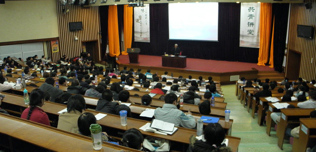 钱教授首先从宏观上阐述了“道”的精髓,即“修己”、“安百姓”、“以天下为己任”。随后,钱教授又从物质生命和精神生命的关系、个体和群体的关系两个方面,阐释了应该追求何种个人价值。最后,钱教授鼓励同学们在实践《论语》精神时,要尽量做到如下三点:“见义勇为”、“忠恕之道”、“齐之以礼”。钱教授在整个讲授过程中,深入浅出,将《论语》中阐述的深刻命题以易于同学们理解的方式表现出来,体现了一位大师对于国学的深刻理解与领悟。讲座中,钱教授结合当下大学生心态浮躁、读书少等现象,详尽阐明了花一定的时间深刻的读透一两本典范之作对于人生发展、为人治学等方面之裨益。钱教授从思想层面出发,以一位读书人经历时间考验的思考与沉淀,为同学们解读了国学中的精粹之笔,他的每一句语重心长的传授,都引起了同学们的深深思索。