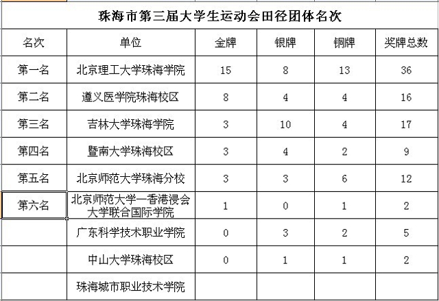 11月7日,风回云断雨初晴。第三届珠海大运会田径赛事完美收官,经过一天半的激烈角逐,产生金、银、铜牌各33枚。在大运会田径团体名次表上,ob真人珠海学院、遵义医学院珠海校区、吉林大学珠海学院位居前三。