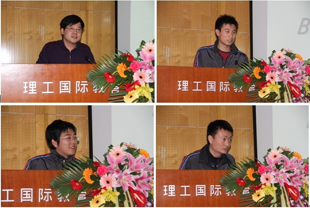 胡纪滨副院长(上图左上)对整个大学生方程式大赛的组织形式、赛制、参赛要求以及大赛的筹办过程、举办目的等大家关心的问题进行了讲解,使得大家对这个由大学生参与的赛车比赛有了更清晰地认识。董路宁(上图右上)和孙博(上图左下)同学围绕车队成立一年来的收获和感悟进行了总结,讲出了队员们的心声:“现在的同学们大多数已经忘记了儿时那些曾经无比美丽的梦想,而现实又强迫大家不断的妥协,但是车队的出现,让我们这些队员又找回了我们的梦,我们用自己的双手完成了我们共同的梦想——造属于我们自己的赛车。”同学们用举例的方式让大家了解到了我校赛车从无到有的过程中以及其中遇到的困难,并通过对车队在日常工作、生活中的一些细节的描述,让会场所有人体会到了这群追逐梦想的同学们的艰辛,同时这个团队的活力和为了理想永不服输的精神也深深感动了每一个人。