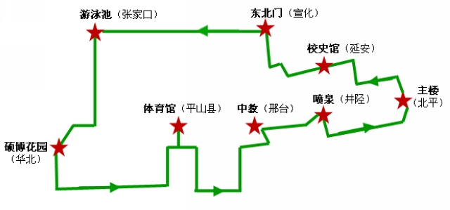 本次比赛途中设置主楼、校史馆、东北门、游泳池、硕博花园、体育馆、中心教学楼及中心花园喷泉共八站,分别对应着我校不同时期校址。其中“宣化站”、“华北站”、“井陉站”设置了校史知识问答和趣味游戏,使同学们在环校义跑的同时休息放松,也增加了本次活动的知识性和趣味性。