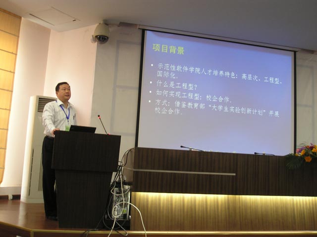 闫达远教授在高校合作经验分享环节,就“学生创新实验室项目合作”做了主题报告,介绍了软件学院与IBM公司合作开展学生创新试验的背景,实施方案以及取得的成果。