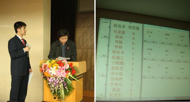 评委们当场投票后,学校研究生工作部部长郝洪涛老师在主持人的监督下现场唱票,并通过大屏幕现场即时显示计票,并公布了评选结果。因竞争比较激烈,第一轮投票产生了9名获奖同学(获奖人为10名),最后由4名重票的同学分别作1分钟陈述争取,4选1确定了最后一名获奖的同学,每名同学将获得5000元奖金。