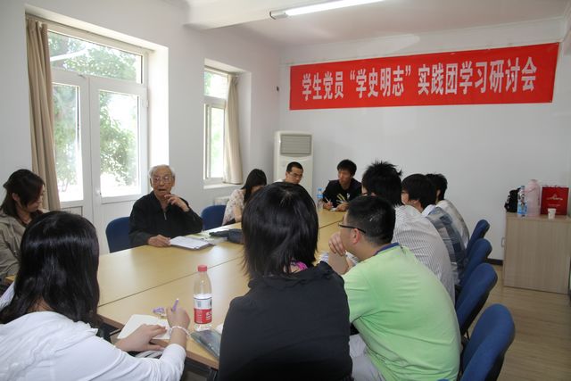 离休教师杨述贤向与会学生党员骨干介绍了延安自然科学院师生因战火所迫辗转至张家口,与晋察冀边区工业专门学校合并办学的基本情况,以及“工专”师生的学习生活情况,并耐心解答了学生党员的提问。交谈中,他多次强调“自力更生,艰苦奋斗”是学校最根本的传家宝,学校始终坚持将国家需要放在第一位,坚持培养“又红又专”的人才;他希望同学们时刻牢记“为人民服务”的宗旨,树立学习目标并为之努力。此外,他还就外语学习、个人发展等问题为在场学生提供了具体建议。