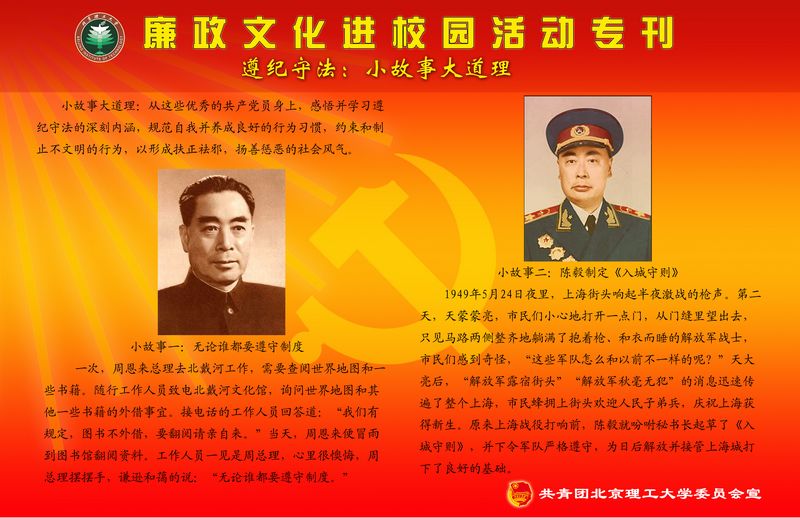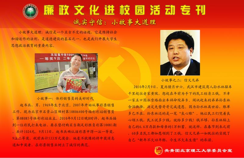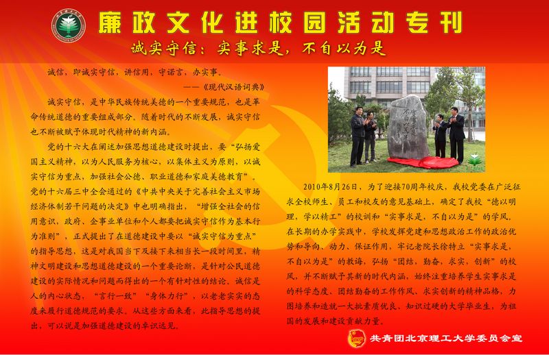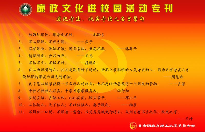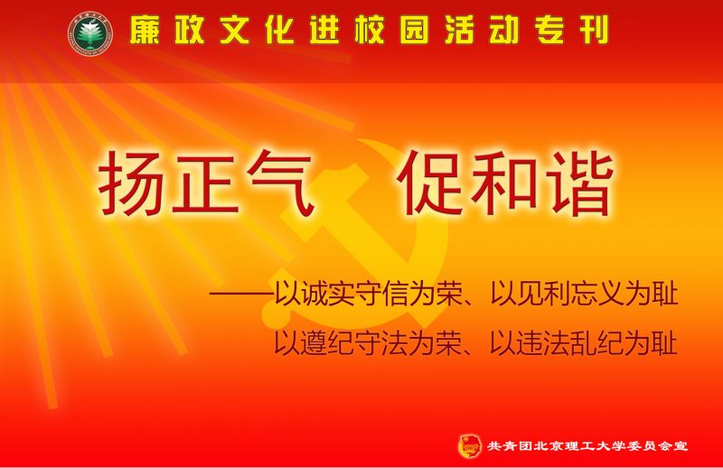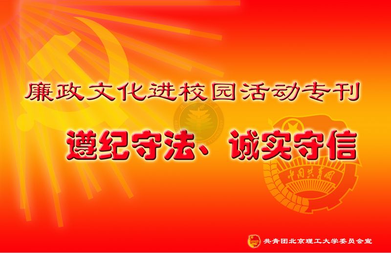 【编者按】按照学校《ob真人2011年党风廉政建设宣传教育月活动实施方案》的要求,校团委从近日起,将依托校园网络、橱窗等主要宣传阵地,面向全校青年学生开展“遵纪守法 诚实守信”为主题的宣传工作,旨在通过在全校范围内进行主题宣传教育,加大廉政文化进校园宣传力度,进一步提高学生的纪律观念、法制观念和诚信意识。