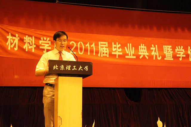 首先由四个系部的领导分别介绍自己系部到场的教师,熟悉的师长们起身转身示意的时候,同学们的掌声欢呼声不绝于耳,用心中的感谢和感激将会场气氛推到炙热。材料学院党委书记陈鹏万教授代表学院向所有毕业生致辞,对所有毕业生顺利完成学业表达最衷心的祝贺,同时陈书记分别从“材料”、“才子”和“财富”寄语毕业生,希望所有材料学院毕业生将来能成为国家“材料”之栋梁,祖国建设之“才子”,为自己积累丰富的人生“财富”。