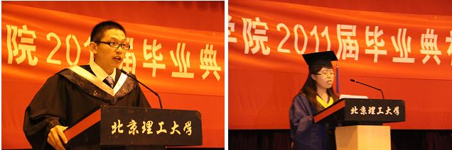 09级工程硕士赵娜以及2007级本科生武金丹依次代表研究生毕业生和本科生毕业生发言。从两位同学的发言中,充盈着毕业生对父母多年养育之恩的涕零感激;满怀着毕业生对母校及老师朝夕相处的感恩眷念;丰富着毕业生对同窗好友的难舍难分。